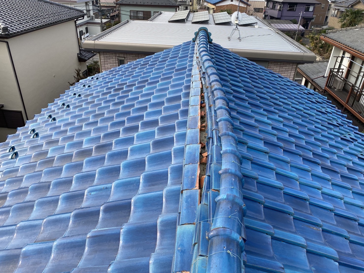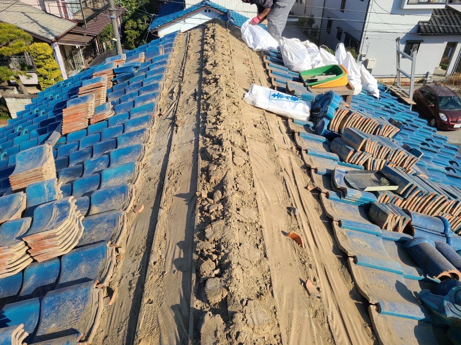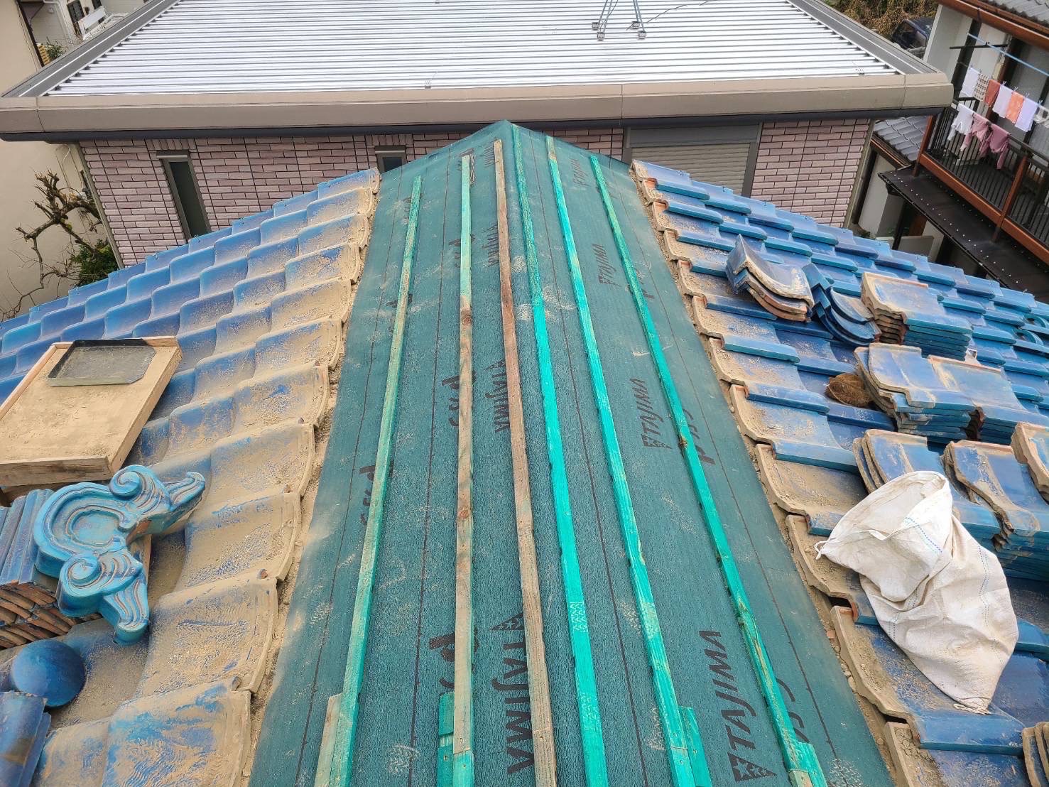 既存棟瓦及び平瓦解体・棟下防水シート新設・瓦桟新設・平瓦葺き戻し・棟積み戻し